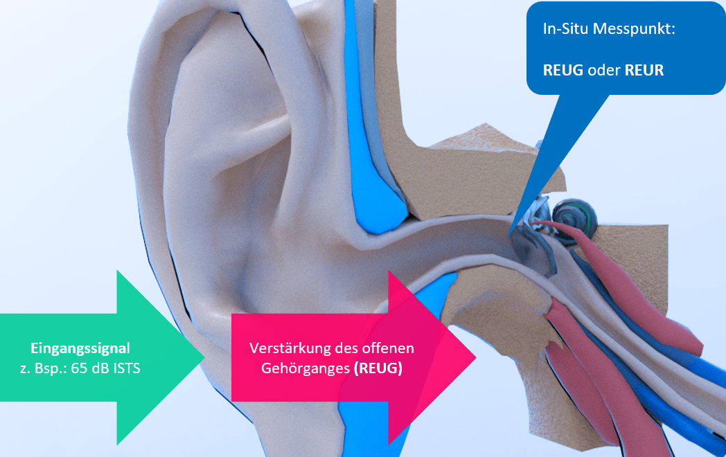 Die Messung REUG (Real Ear Unaided Gain) erfasst die Verstärkung des offenen Ohres ohne Hörsystem. Diese entsteht durch die anatomische Physiologie der Ohrmuschel und des Gehörgangs. Die Ohrmuschel erzeugt naturgemäß vor allem im Hauptsprachbereich eine deutliche Verstärkung. Diese erreicht ungefähr 20 dB, hauptsächlich im Bereich zwischen 2-4 kHz. Durch frequenzabhängige Abschattung und Verstärkung von Schall aus verschiedenen Richtungen dient sie auch dem Richtungshören.